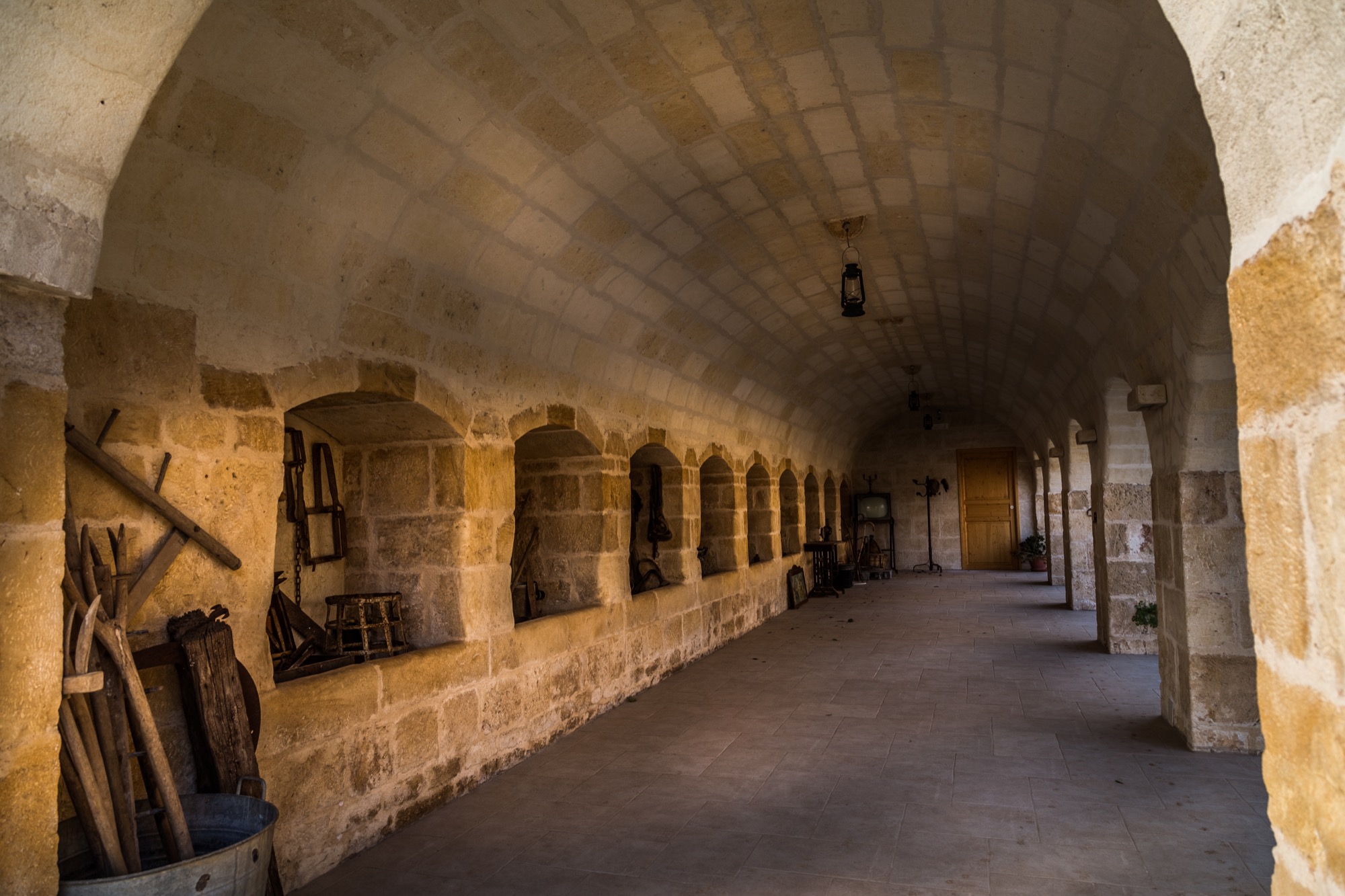L’architettura del Museo, con le sue volte in pietra e gli spazi accuratamente restaurati, accoglie i visitatori in un ambiente che racconta secoli di vita contadina. Ogni angolo custodisce il ricordo di un’epoca fatta di lavoro, tradizioni e ingegno. Passeggiando tra gli archi illuminati dalla luce del tramonto, si percepisce l’anima autentica della Masseria, un luogo dove il passato continua a vivere e a ispirare.